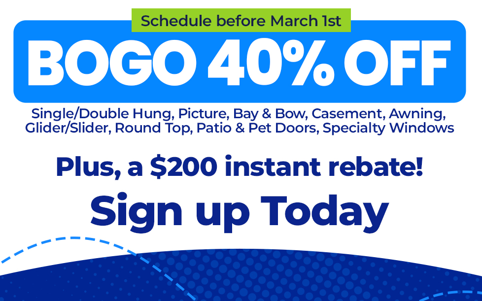 *Buy 1, get 1 40% off all windows, patio, and pet doors. Discounted window applies to equal or lesser value. Minimum purchase required. Offer valid on residential home purchases only. Cannot be combined with other offers, discounts, or prior purchases. Financing available with approved credit. Additional restrictions may apply. See Harley Exteriors design consultant for complete details. Offer expires 2/28/26.